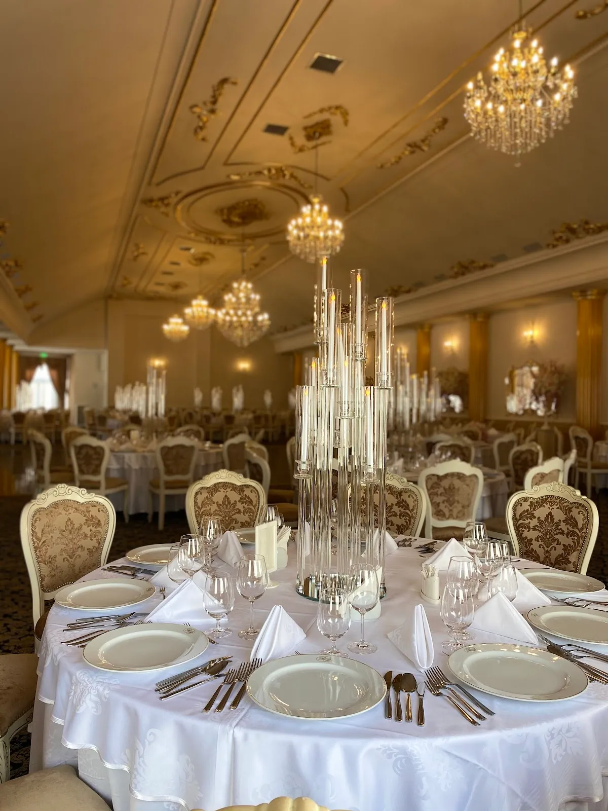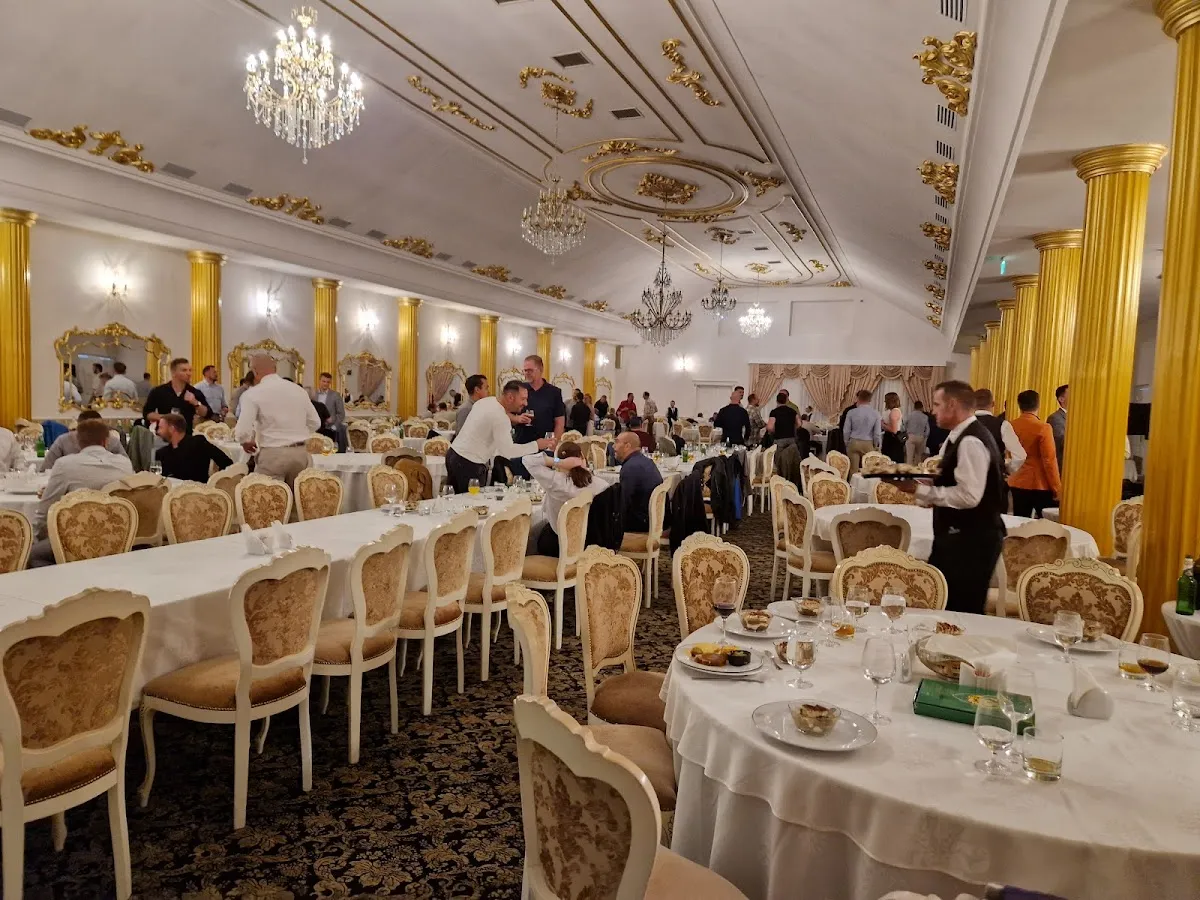 Interiorul restaurantului se remarcă prin coloane aurite, candelabre cu cristale și oglinzi mari, care creează o atmosferă unică și distinsă. Sala principală dispune de un ring de dans central generos, oferind suficient spațiu pentru ca invitații să se bucure de momentele speciale ale evenimentului. De asemenea, locația beneficiază de o terasă spațioasă, ideală pentru momente de relaxare în aer liber.