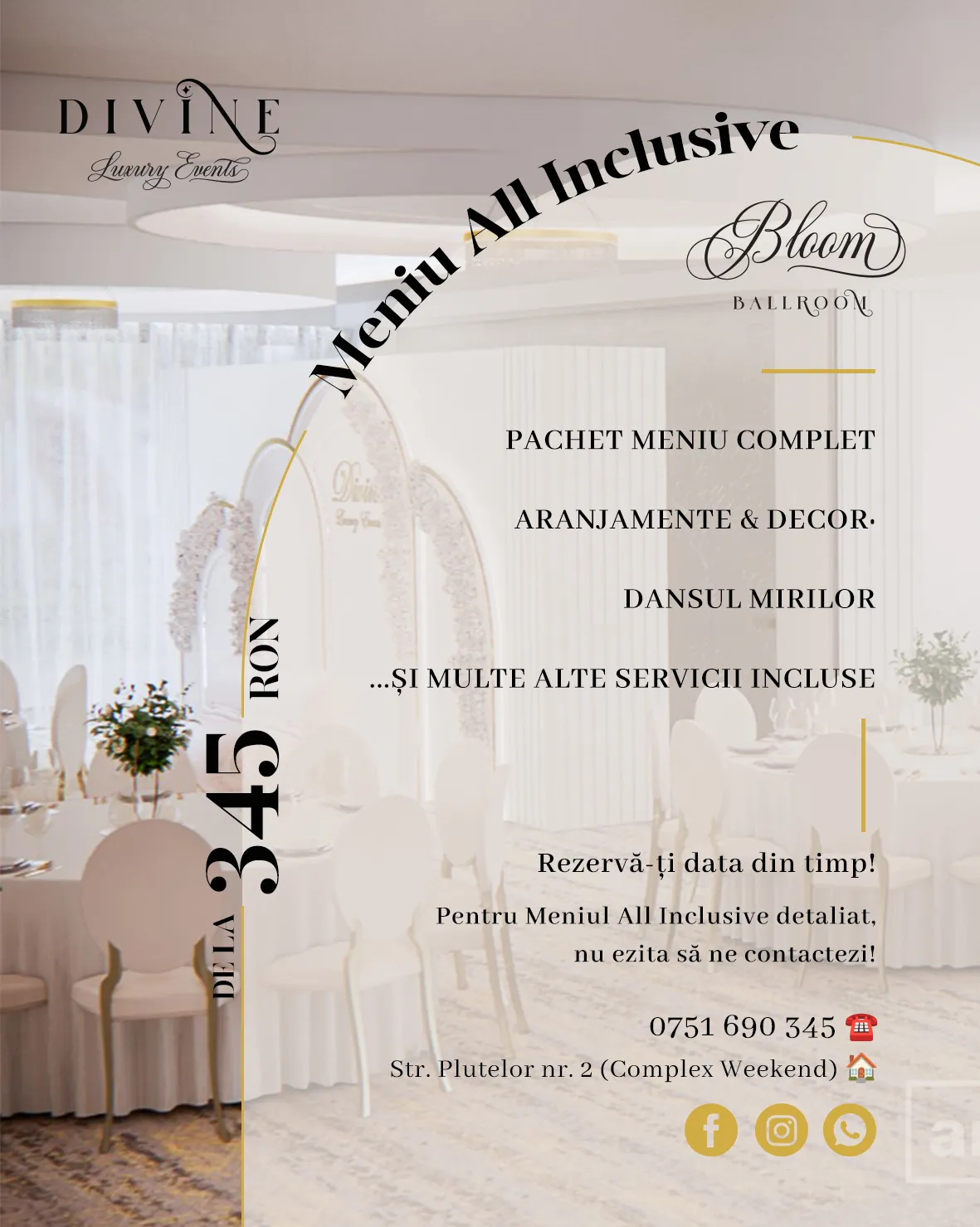 Divine Luxury Events Mureș este o locație elegantă situată pe Strada Plutelor 2, 540314 Târgu Mureș, România, specializată în organizarea de evenimente memorabile, precum nunți, botezuri și alte ceremonii importante. Cu un design modern și facilități de top, această locație promite să transforme orice ocazie într-un moment de neuitat.